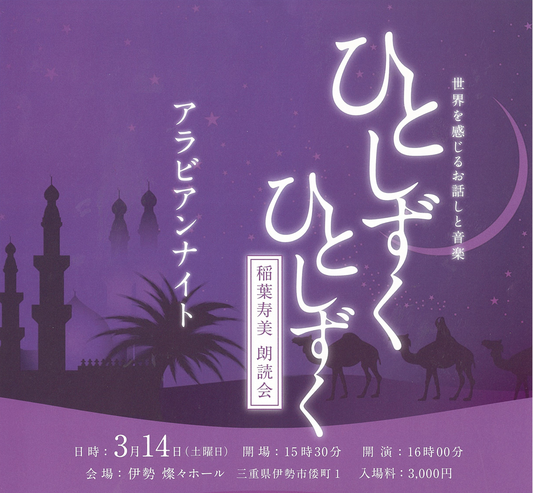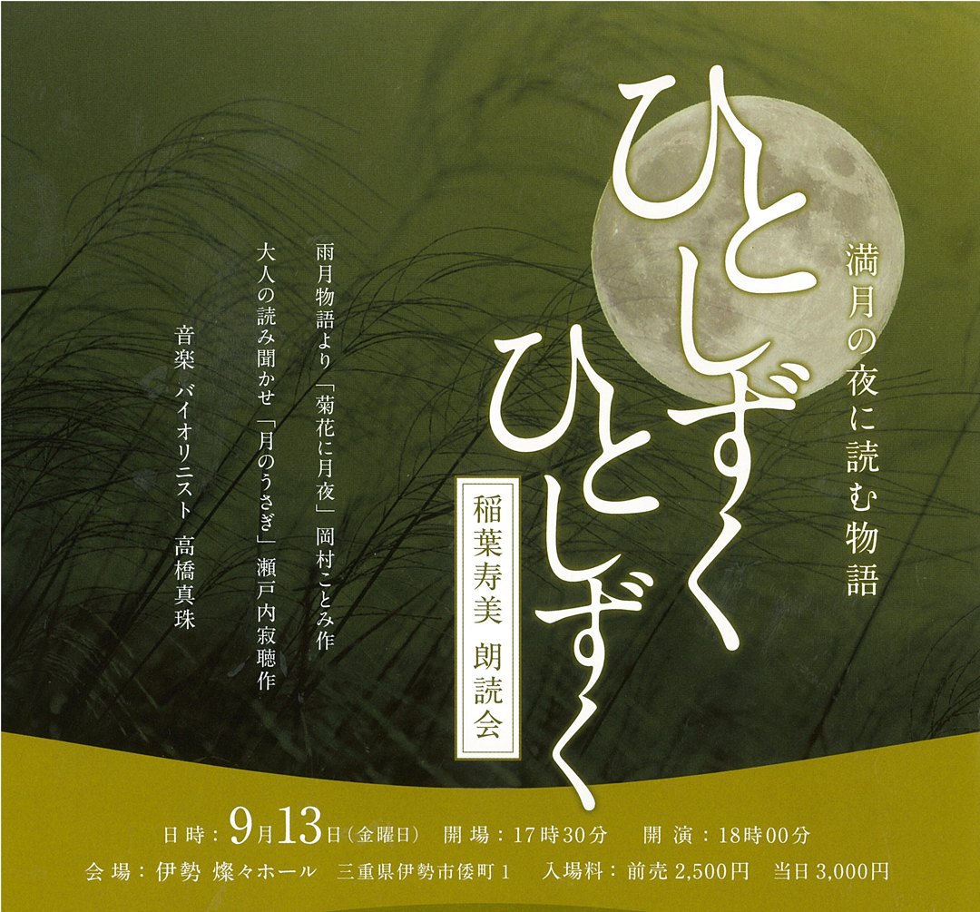 元東海TVアナウンサーの稲葉寿美さんによる朗読会。ピアノとヴァイオリンのBGに乗せ巧みなお話の世界を味わう