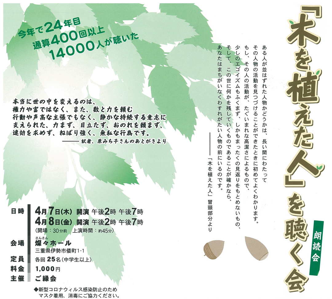 ハープの音色が物語の世界を情景豊かに表現し、ホール外の桜の木をライトアップしたり自然の雰囲気を上手く演出に使いながら余韻を一層引き立てた。2日間昼夜4公演、100名満席。